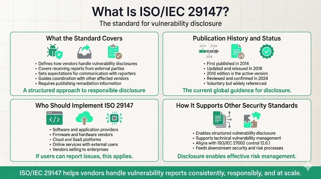 ISO/IEC 29147:2018 is the international standard specifically addressing vulnerability disclosure. Published in October 2018, it superseded the 2014 edition and was reviewed and confirmed as current in 2024. The standard provides requirements and recommendations for vendors to establish vulnerability disclosure policies, receive reports from external security researchers, coordinate remediation, and publish security advisories. Organizations implementing ISO 29147 create structured processes that reduce risk by enabling proactive vulnerability remediation before exploitation.